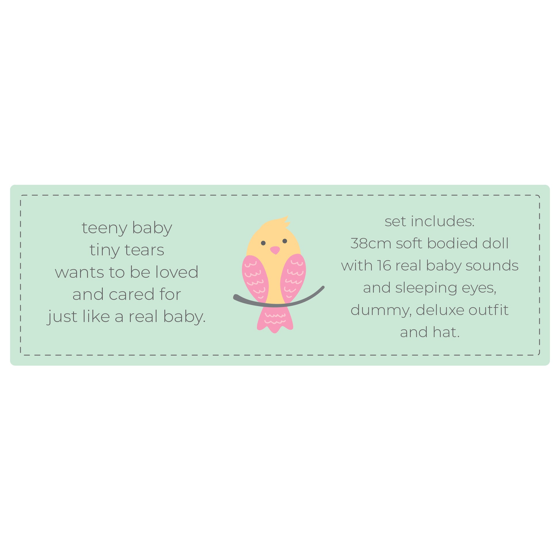 The Baby Soft Tiny Tears is a soft bodied 38cm doll. Just like a real baby, Tiny Tears needs lots of love and attention. Teeny Tiny Tears encourages little ones to be empathetic and responsible, while nurturing their baby doll.