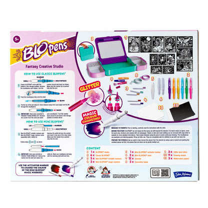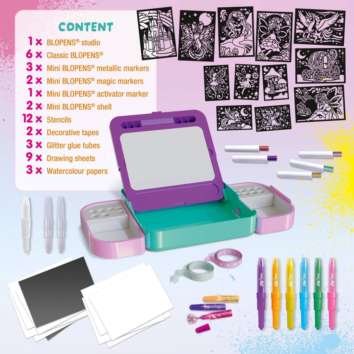 - WHAT’S IN THE BOX? Includes 1 BLOPENS Studio, 2 storage compartments, 11 BLOPENS (classic, metallic, and magical colour-changing), 12 stencils, 9 drawing sheets, 3 watercolour papers, 2 rolls of printed tape and 3 glitter glue tubes.