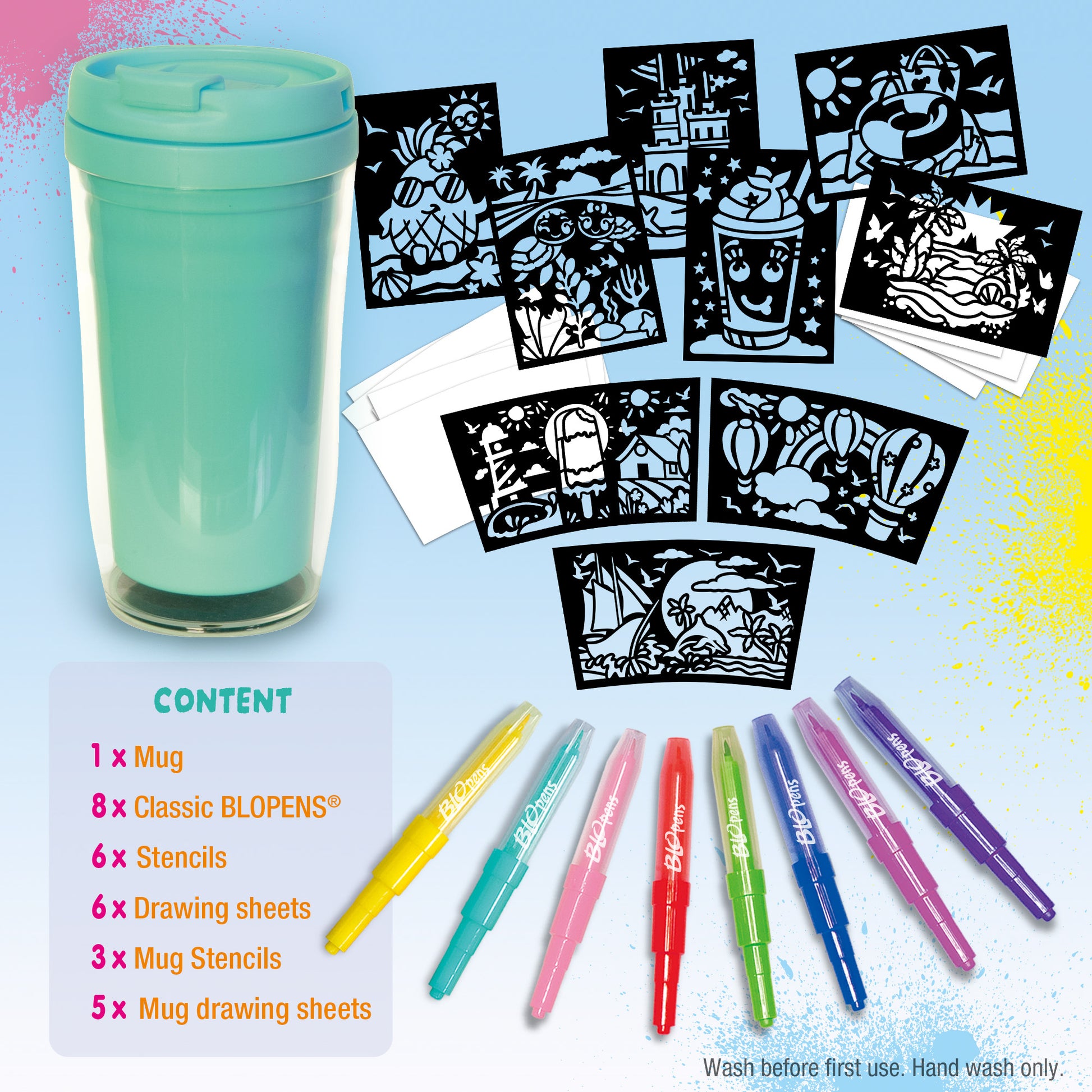- Personalise Your Travel Mug with BLOPENS: Blow into the BLOPENS to reveal vibrant designs using reusable stencils—perfect for showing off your style!