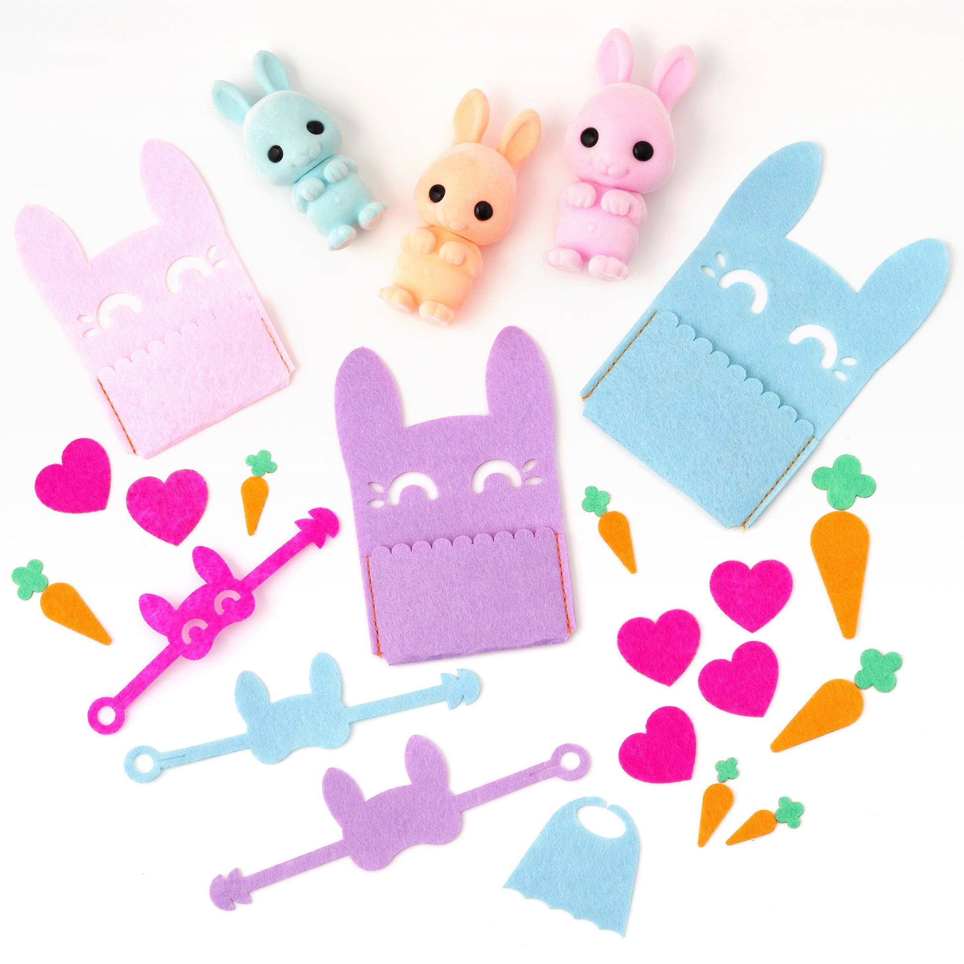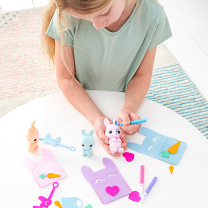 •WHAT’S IN THE BOX?: Includes three bunny figures, three washable felt tip pens, three beds, felt accessories and instructions.