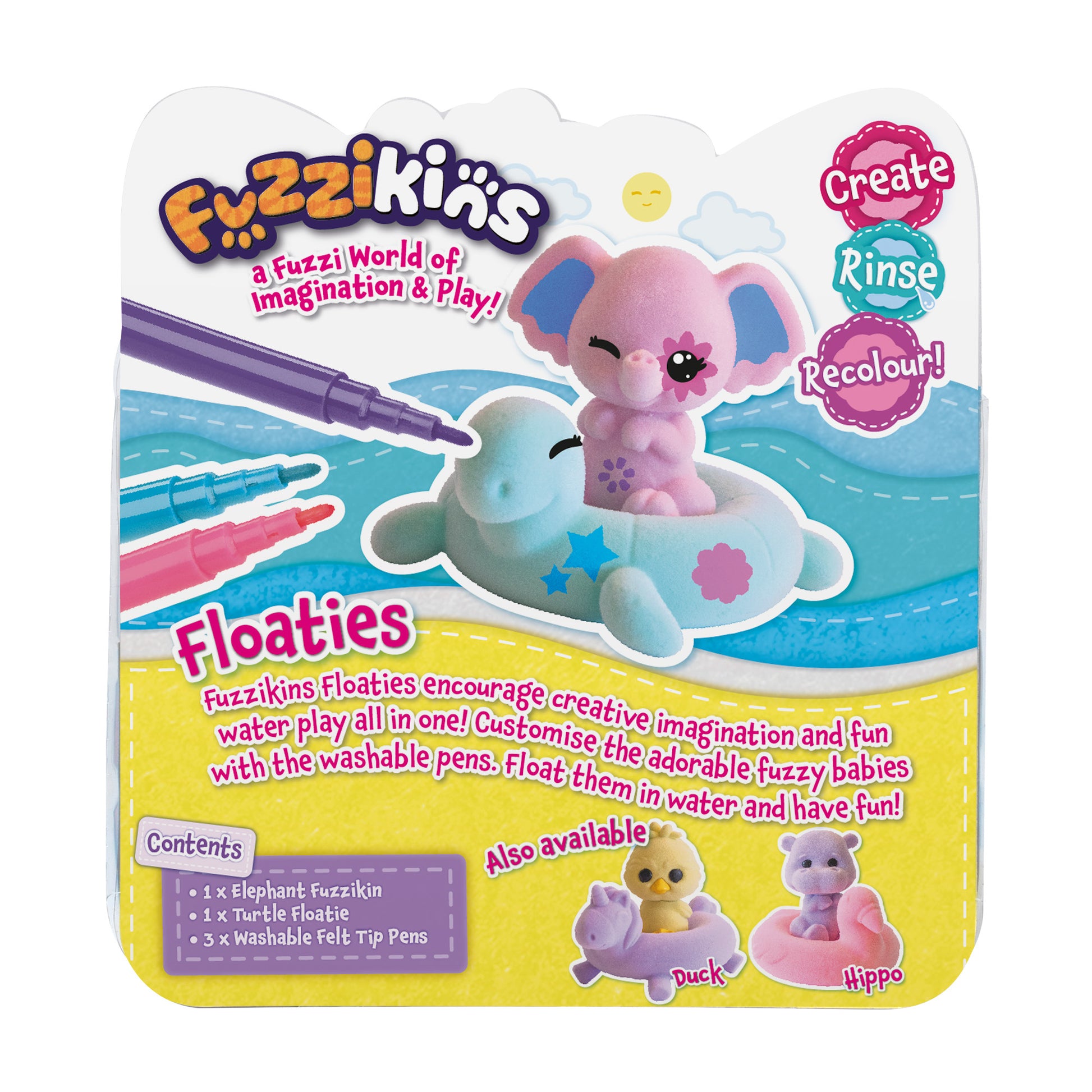 • COLOURFUL CUTIES: Dive into a world of imagination with the Fuzzikins Elephant and Turtle Floaties! Colour, play and personalise your adorable animal friend with washable pens – the fun never ends!