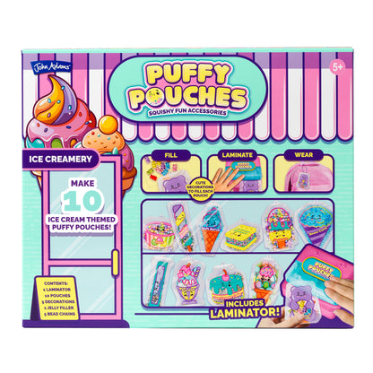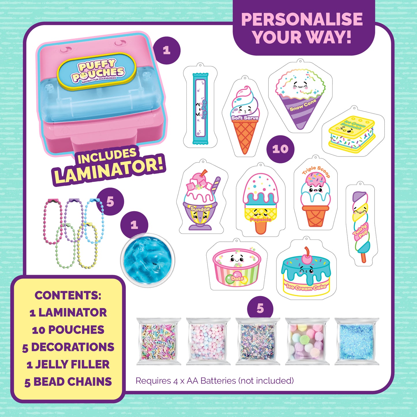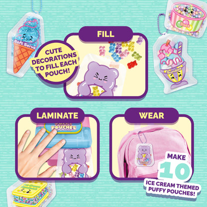 - Fill, Laminate & Wear: Simply fill your Puffy Pouches with adorable ice cream parlour decorations, laminate them with the included tool, and wear your creations!