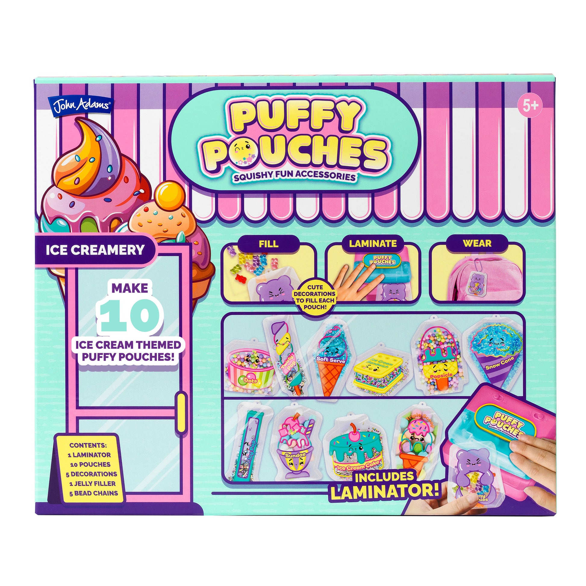 - Fidget Fun in Cute Characters: Make 10 squishy, ice cream-inspired Puffy Pouches that are fun to squish, wear, and share with friends.