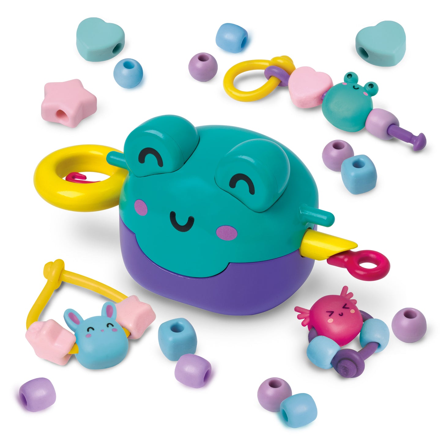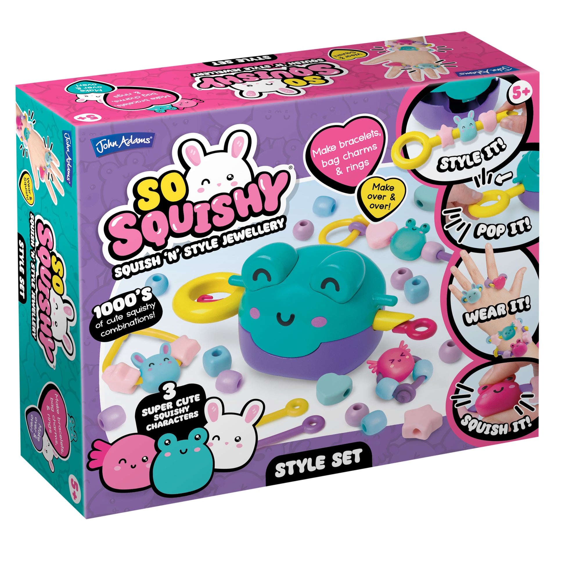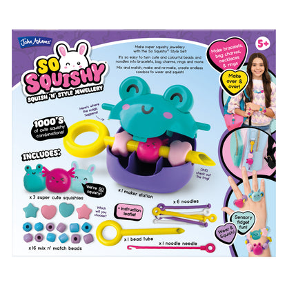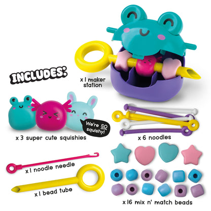 - THE ULTIMATE SENSORY EXPERIENCE: Kids can make, wear, squish, and have endless fidgeting fun! The So Squishy Style Set Includes 1 Frog themed Maker Studio, 3 super cute squishies, 16 mix n’ match beads, 6 noodles, 1 noodle plastic needle, 1 bead tube and instruction leaflet.
