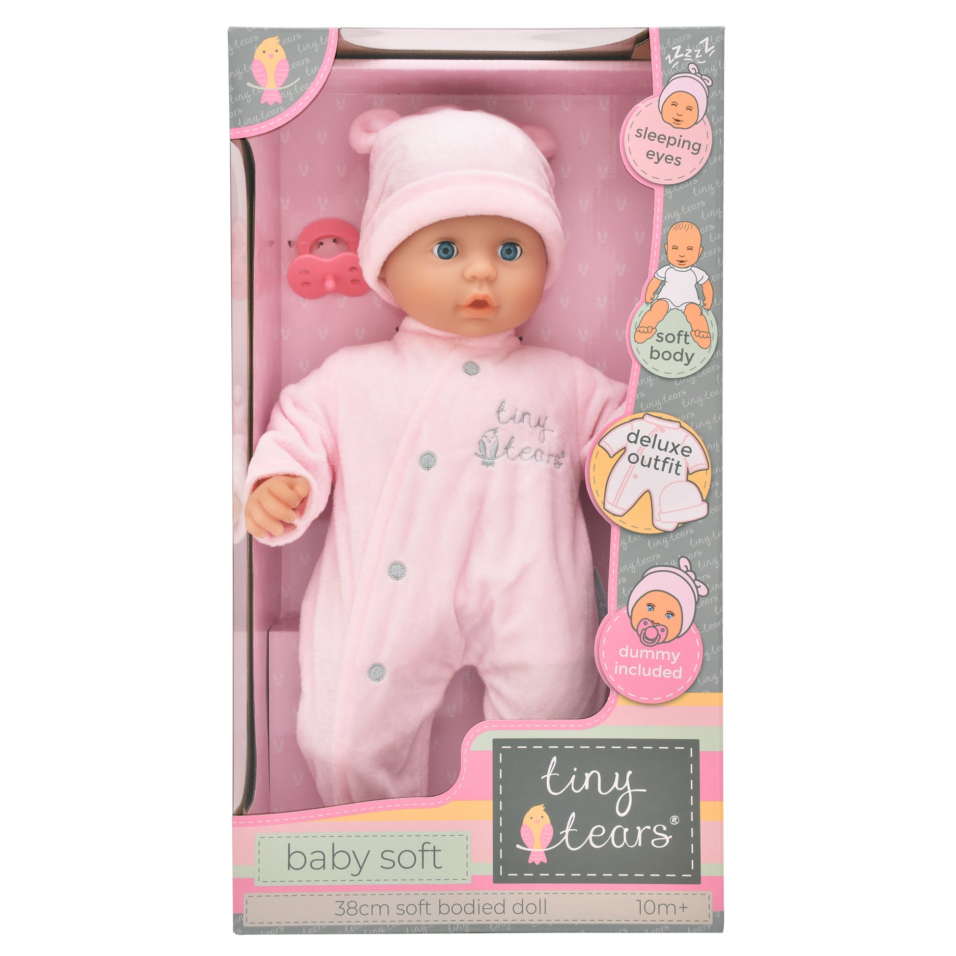 Includes: 38cm soft bodied doll with sleeping eyes, a deluxe outfit featuring hat and baby grow and a dummy.
