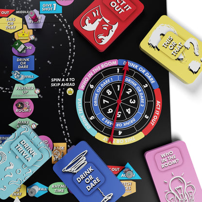 Contents: 1 x board, 1 x spinner, 1 x sand timer, 1 x instructions, 30 x act it out, 30 x drink trivia, 30 x drink or dare, 30 x who inÊtheÊroom, 30 x this or that, 10 x mini playing pieces